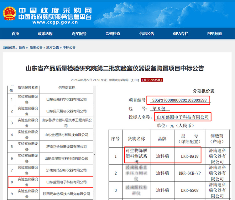 隨著可降解包裝檢測需求陡增,無法滿足檢測任務,近日,山東省產品質量檢驗研究院再次采購迪科瑞自主研發生產的可生物降解測試係統,本次采購不僅是對迪科瑞儀器的信任,同時也是對迪科瑞儀器技術實力最有力的證明。